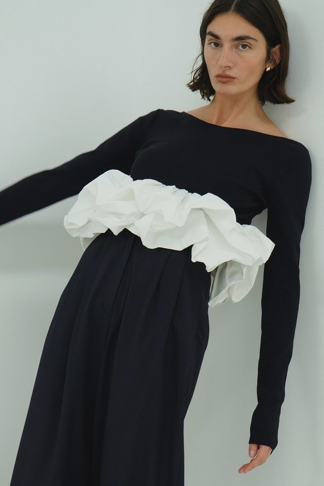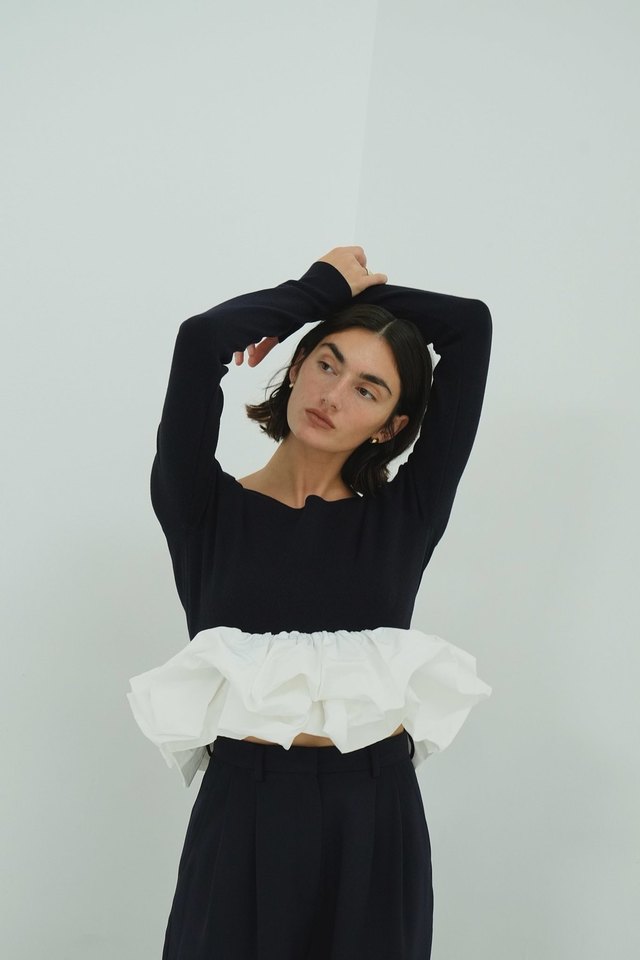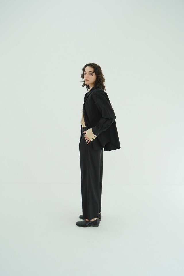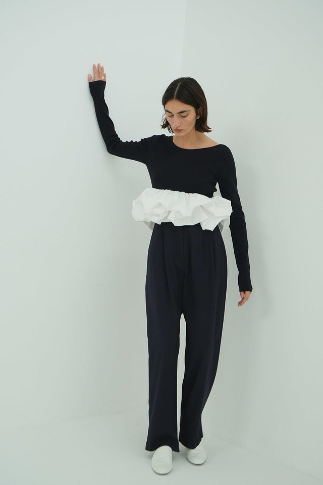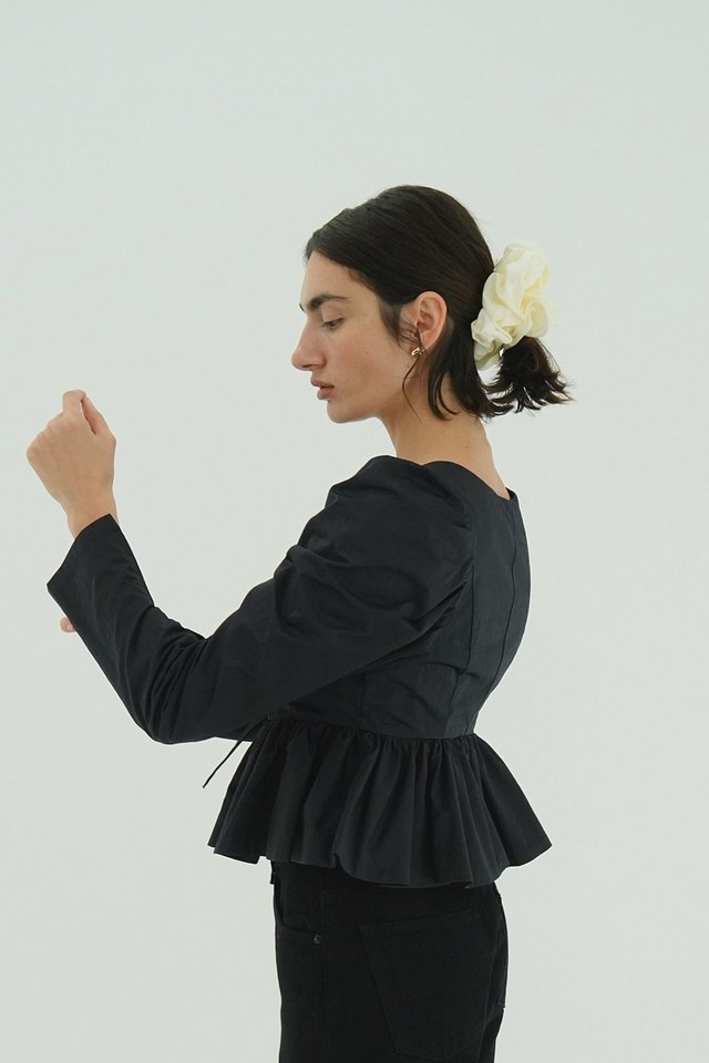 コンパクトなトップス部分に、程よい艶感とハリのある素材で仕上げたバルーンペプラムを組み合わせ、シンプルながらも構築的なシルエットを表現しました。