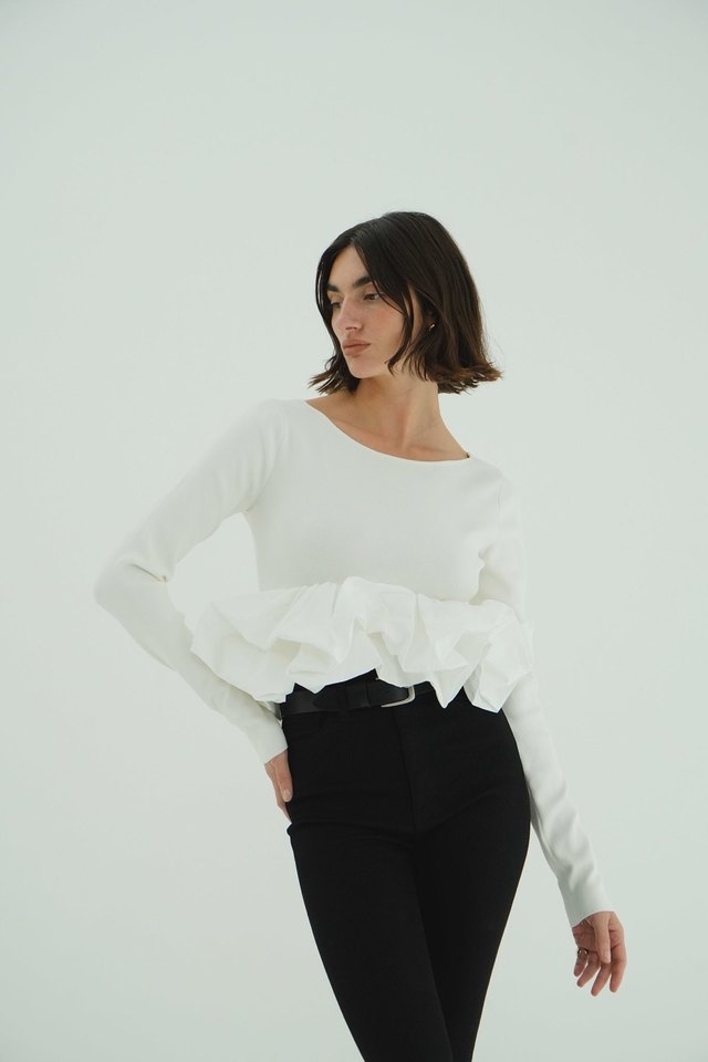高めの位置から広がるペプラムデザインが視線を自然に引き上げ、腰位置を高く見せてくれます。バルーンが腰まわりをさりげなくカバーしてくれて、自然とスタイルアップが叶うニットです。
