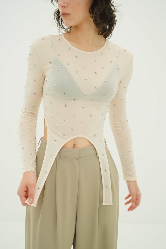 生地は透け感のあるナイロン素材を使用。ナイロン特有のシャカっとした質感で、甘くなりすぎずモードな印象に仕上げました。
