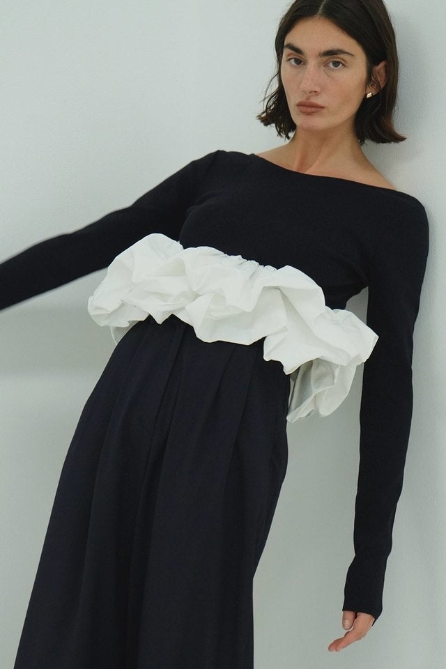構築的な袖に仕上げたレディーライクなシルエットがポイントのデザインシャツ。横に切り替えを入れ、2枚仕立てで仕上げる事でボリューム感のある袖に仕上げました。