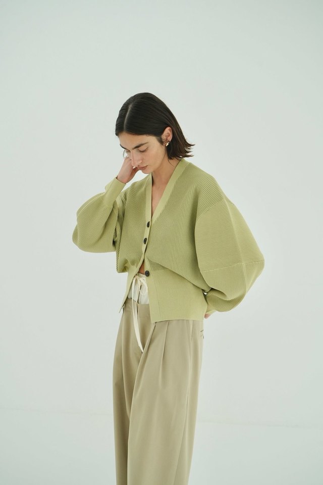 ゆとりのあるボリュームスリーブに対して、ウエストまわりは程よくフィットする設計にすることで、自然とメリハリのあるバランスに。カーディガンタイプなので羽織りとしてはもちろん、トップス感覚でも着られます。
