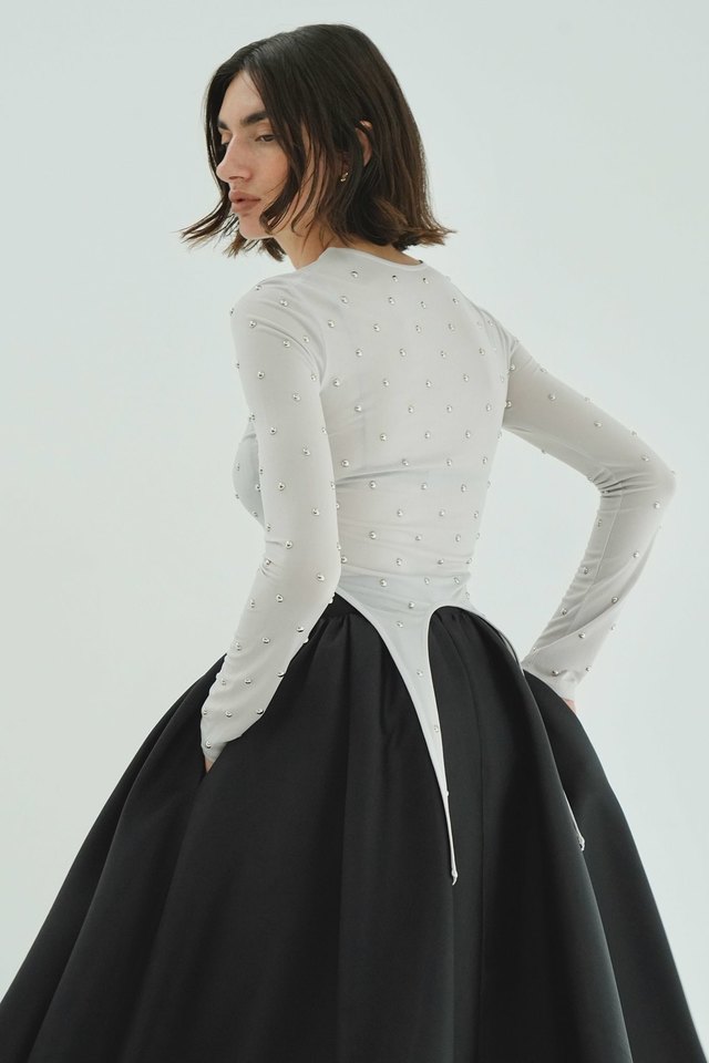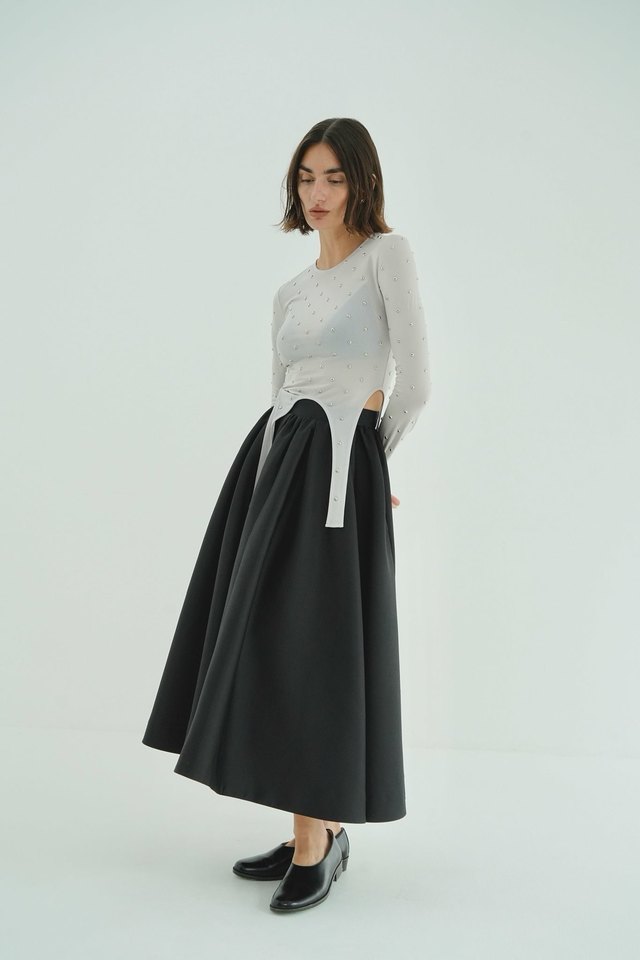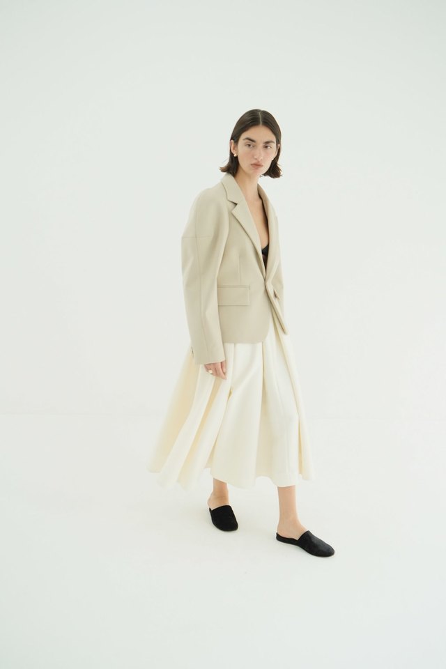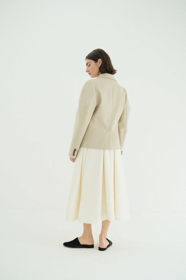 生地の持つハリとしなやかさを活かし、たっぷりと分量を取ったフレアとタックギャザーで、立体感のあるシルエットに仕上げました。