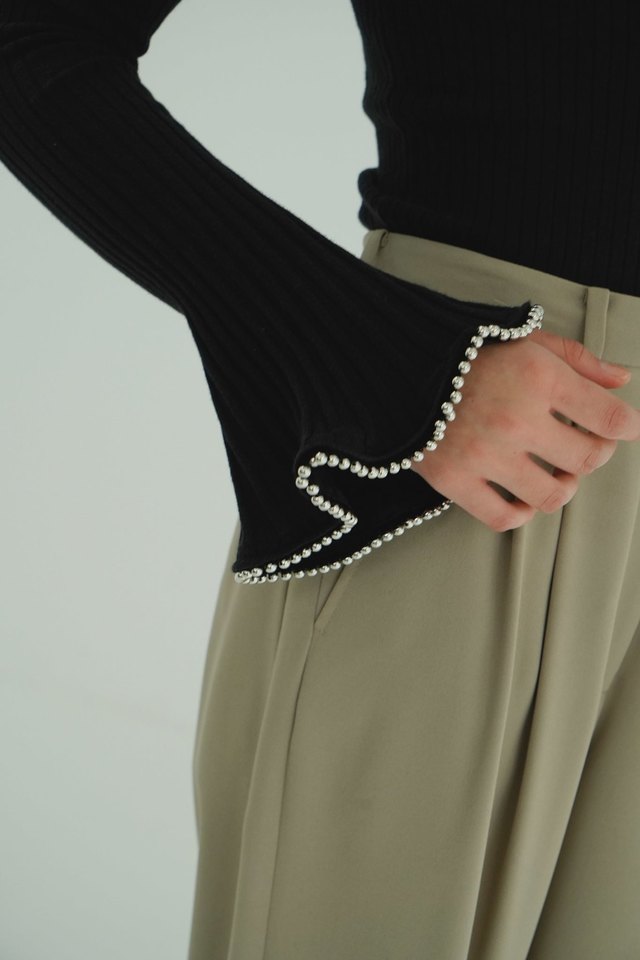 袖口にあしらったシルバーボールが視線を惹きつける、デザインニットトップス。