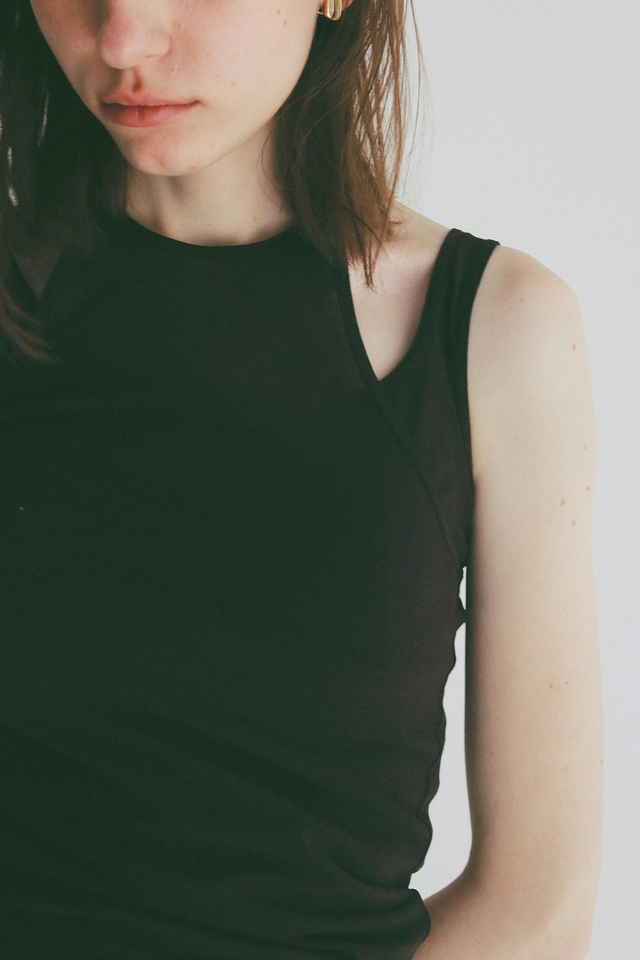 程よいツヤと透け感を兼ね備えたシアー素材を使用した、ホルターネックトップスとタンクトップのセットアイテム。