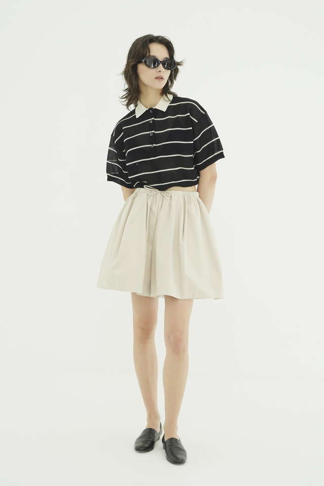 軽やかな透け感のあるシアーニットで編み立てた、ボーダー柄のポロニットトップスをはじめ、程よい光沢感と美しいドレープが上品な印象を与えるオープンカラーシャツ、滑らかなハリ感が際立つローウエストフレアショートパンツ、シボ感のある上品なフェイクレザーを使用したバッグが登場。定番のBASIC TUCK PANTSのネイビー、2WAY TUCK STRAIGHT PANTSのブラックが再入荷いたします。