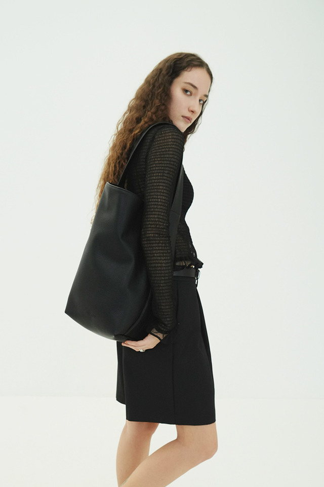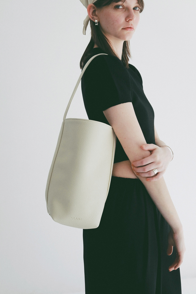 マチを広めに取ったバスケット型フォルムと、両サイドから続く太めのハンドルが、ミニマルで洗練された印象を与えます。