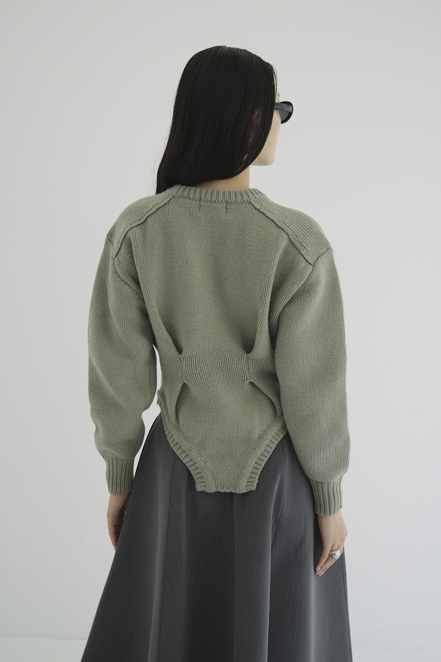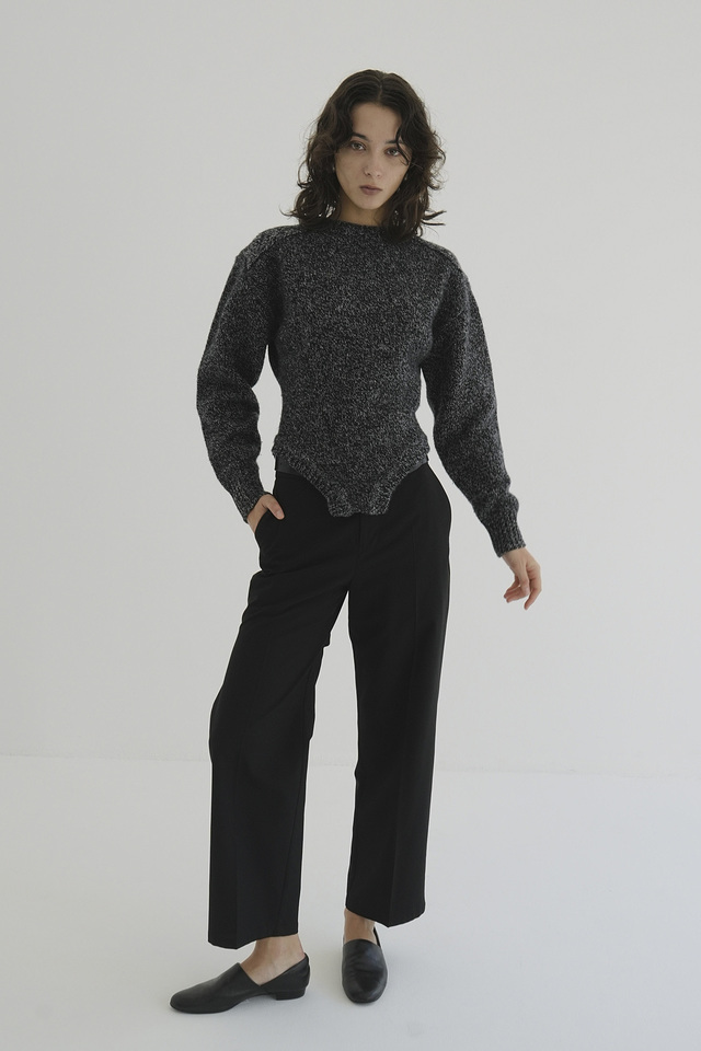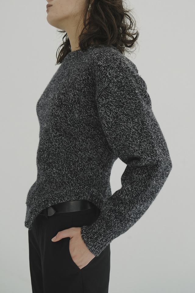 肩周りのボリュームとウエストのラインにこだわり、女性らしさとモードな印象を両立。首元・肩・裾・袖口にリブ編みを施し、立体感のあるシルエットに仕上げています。