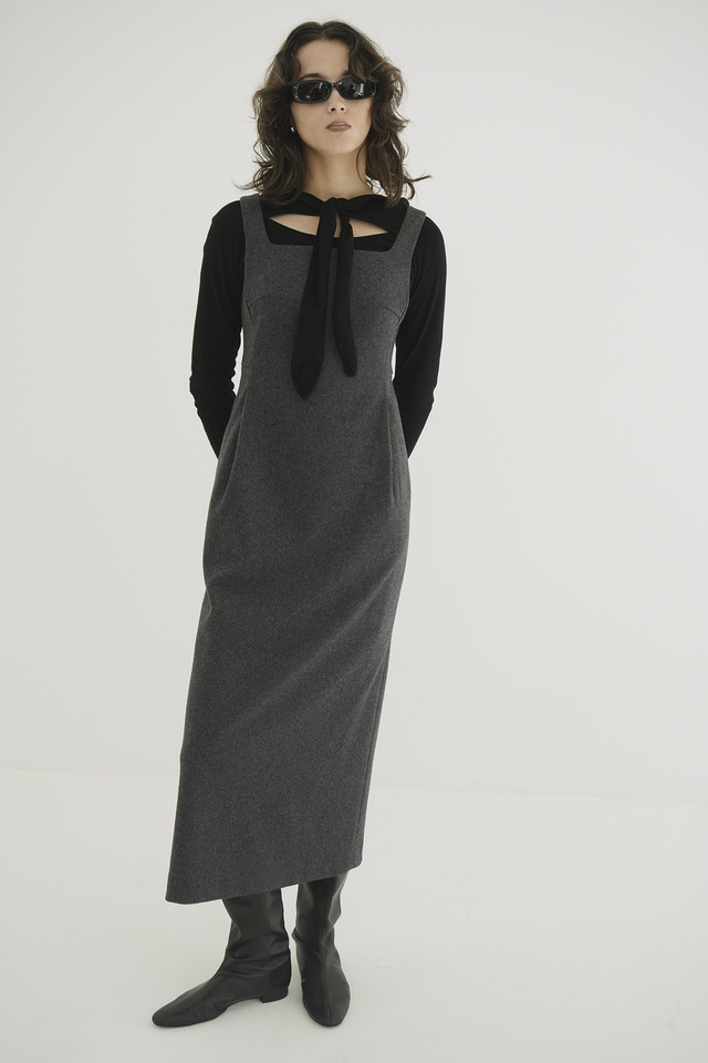 上品なスクエアネックと高めのウエストパネルが特徴のワンピース。