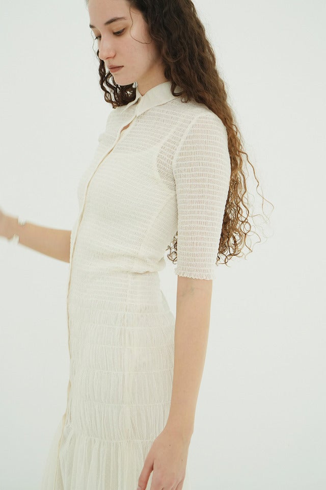 高密度でほどよいハリを持つシャツ地に、繊細なチュールを重ねたミックスファブリックが印象的な一枚です。異なる質感が交差することで、静かな存在感を生み出します。