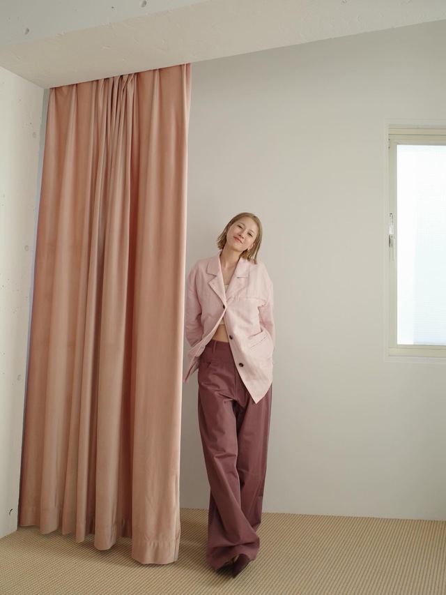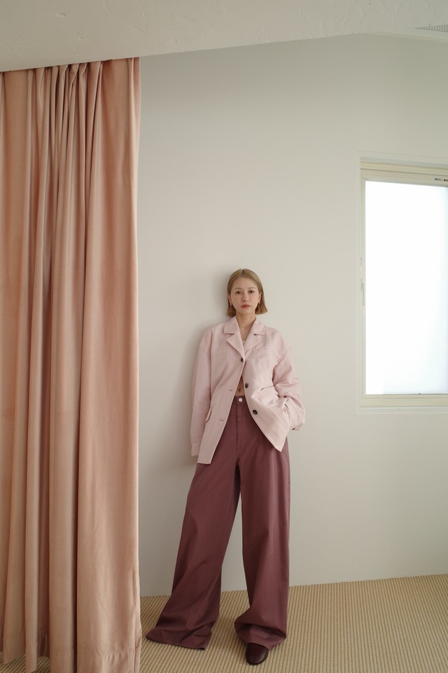 新色のPINKは縦糸と横糸にアイボリーとピンクの2色で織ったニュアンスのあるカラーで、柔らかく肌馴染みの良い桜色。先行予約アイテムのパープルカラーのバレルパンツとも相性の良い色味です。