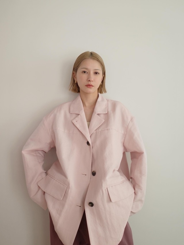 クラシックなムードをベースに現代的なバランスで再構築したシングルジャケット。開きの浅めに設定したテーラードデザインが、凛としたマニッシュさを引き立てます。オーバーサイズでありながら、肩や身頃のバランスを丁寧に整えることで、抜け感のあるシルエットに仕上げました。