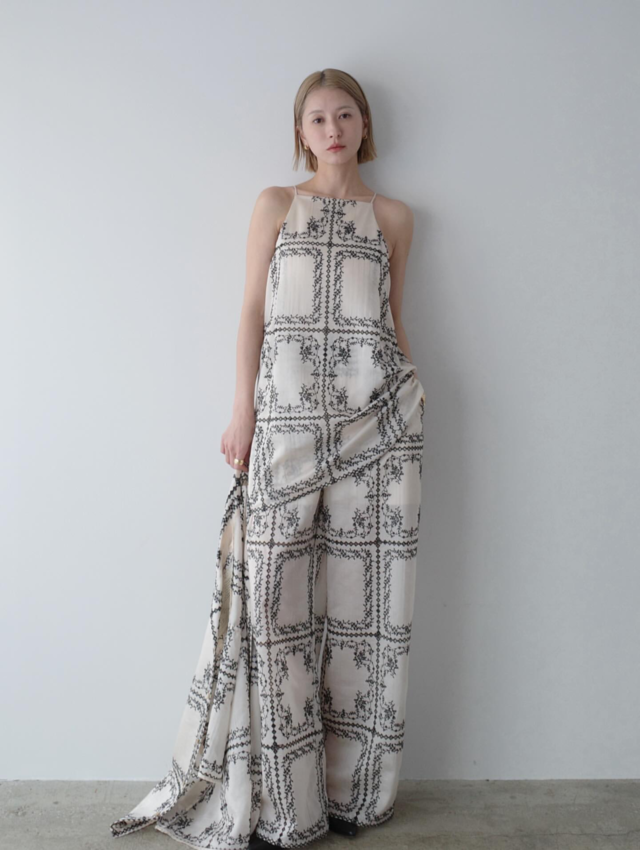 刺繍が華やかなので、華奢なストラップとシャープなネックラインで、すっきりと仕上げました。パンツの内側にはショートパンツ型の裏地を付けているので、ほのかに足のラインが透けて女性らしく着ていただけます。