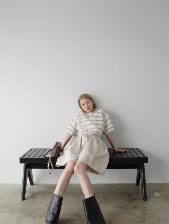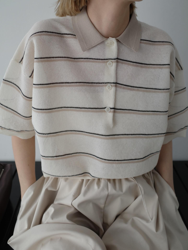 軽やかな透け感を纏う、ボーダー柄のポロニットトップス。