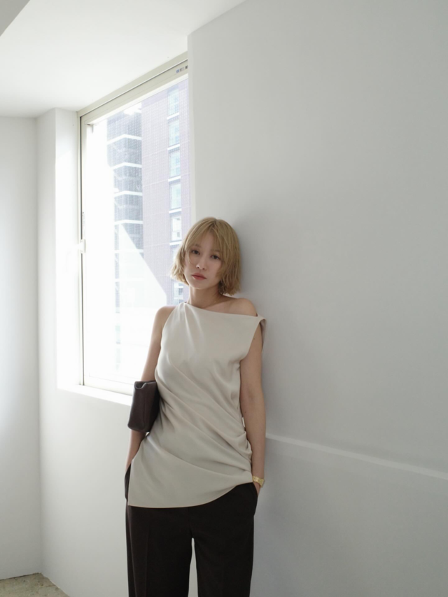 しなやかな落ちる生地が身体の動きに寄り添い、左右アシンメトリーに入れたタックから生まれるドレープがさり気ない立体感を出しています。