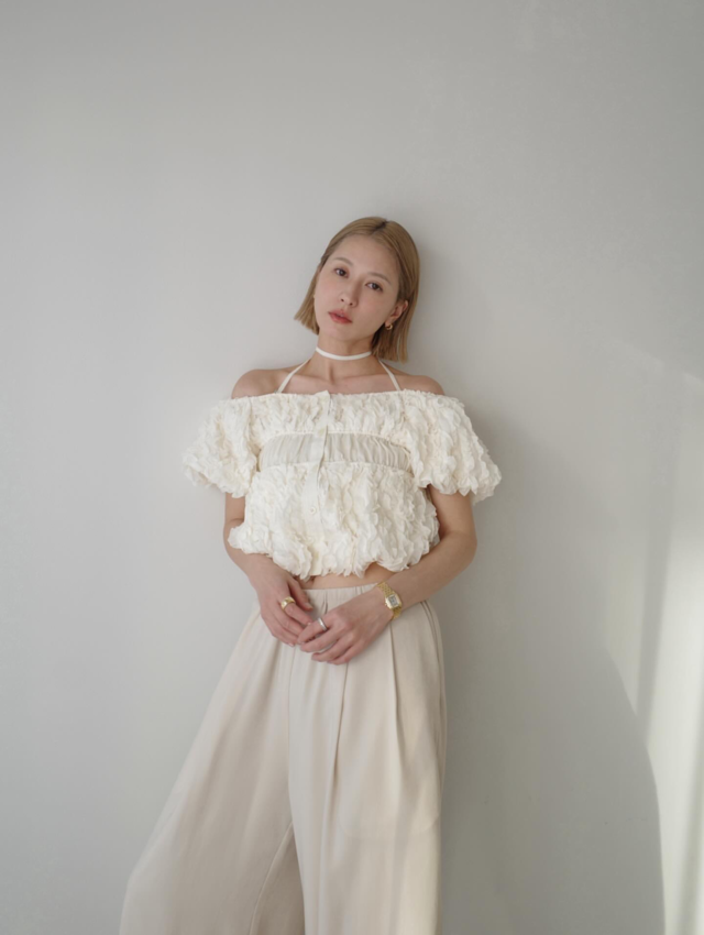 取り外し可能なストリング仕様で、首元のニュアンスを自在にアレンジ可能。袖はやや下げてオフショルダーとしても着用でき、その日の気分やスタイリングに合わせて表情を変えられるデザインです。1枚で印象をつくる、存在感のあるトップスです。