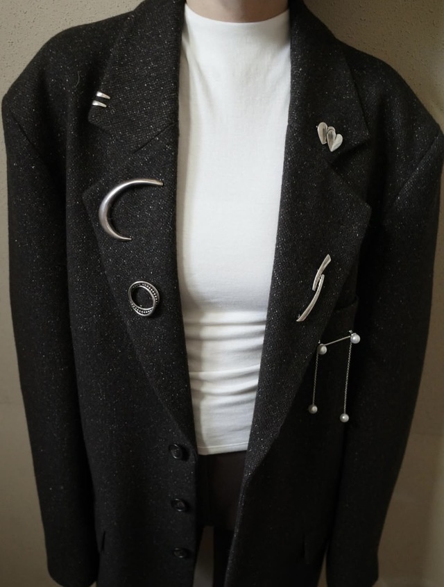 ラペルには月や抽象的なモチーフのブローチをあしらい、さりげない遊び心をプラス。ブローチはお好みの位置にアレンジが可能です。