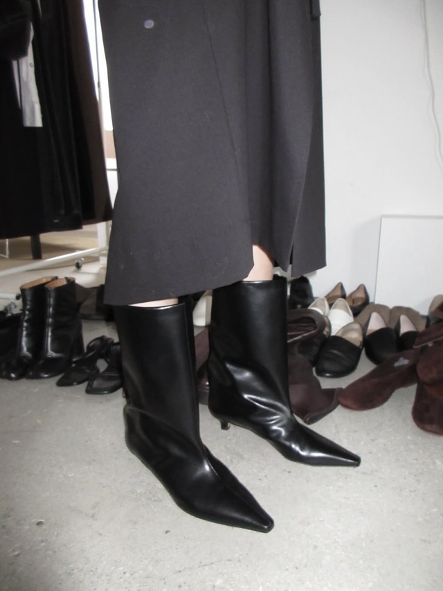 太めの筒とシャープなポインテッドトゥが、スタイリングにモードな印象を加えます。