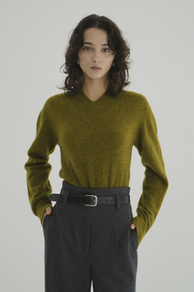 やや高めのVネックデザインが首元を美しく見せ、暖かさと上品さを両立しています。