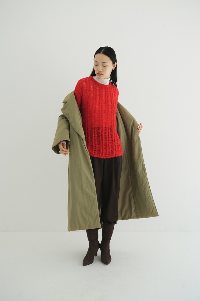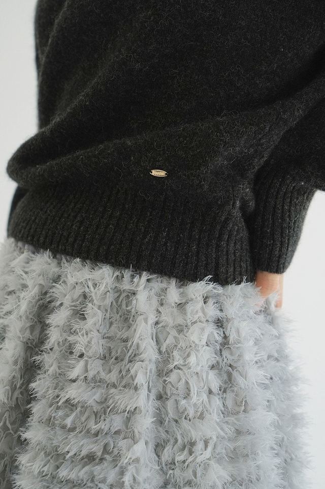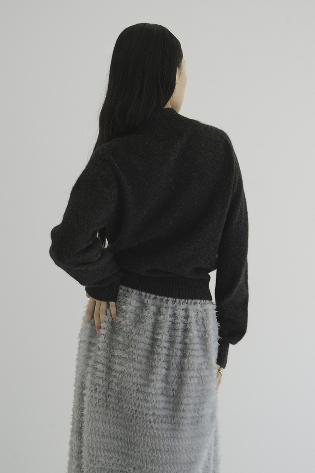 太番手のモヘアとソフトなシャギー糸をミックスさせ、程よい毛足感と軽やかさを表現。針抜き組織により、ふんわりとしたエアリーな風合いに仕上げました。