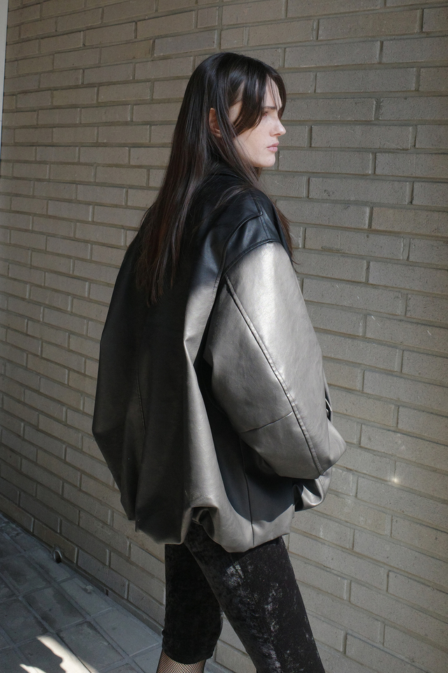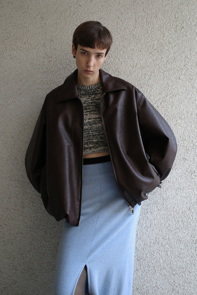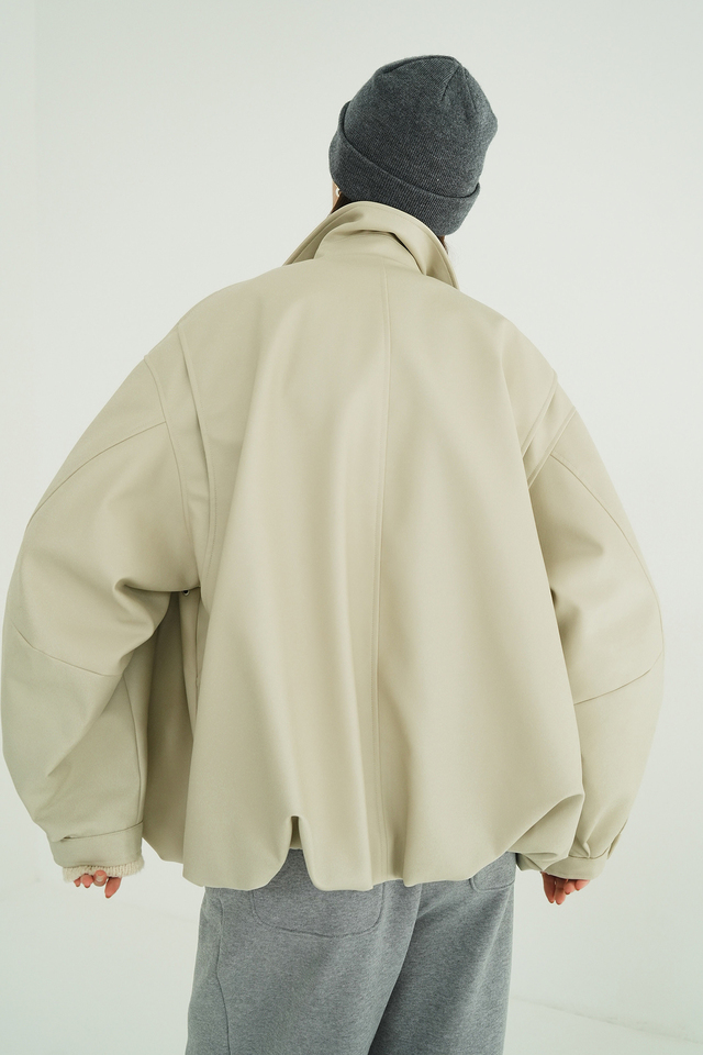 存在感のあるバルーンシルエットが印象的なフェイクレザージャケット。