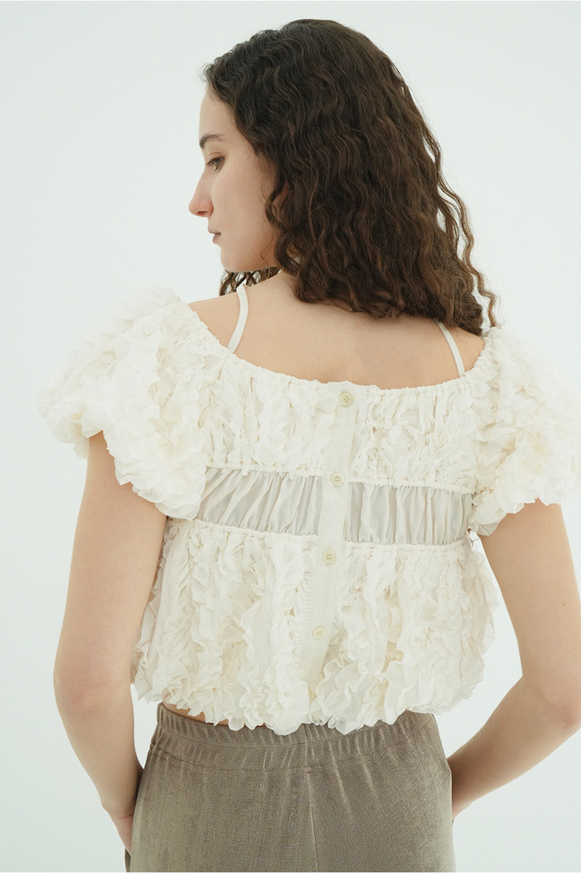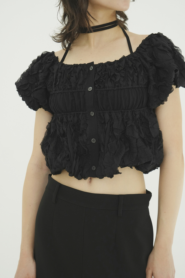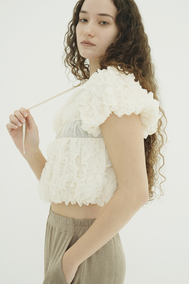 表情感のあるほのかなシアー素材に、程よいハリのあるフリルを太番手であしらったデザイントップス。甘さを程よく抑え、洗練されたモードな印象に仕上げました。