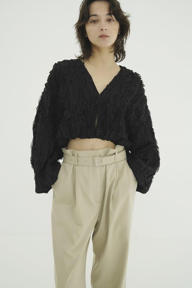 TOPSTITCHED FRILL BOLEROと合わせてセットアップでの着用も可能。トレンド感と機能性を両立した一本です。
