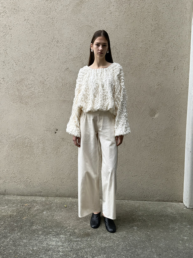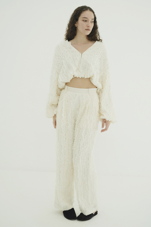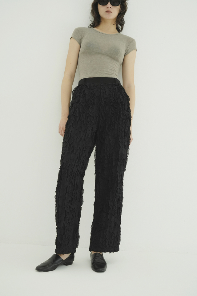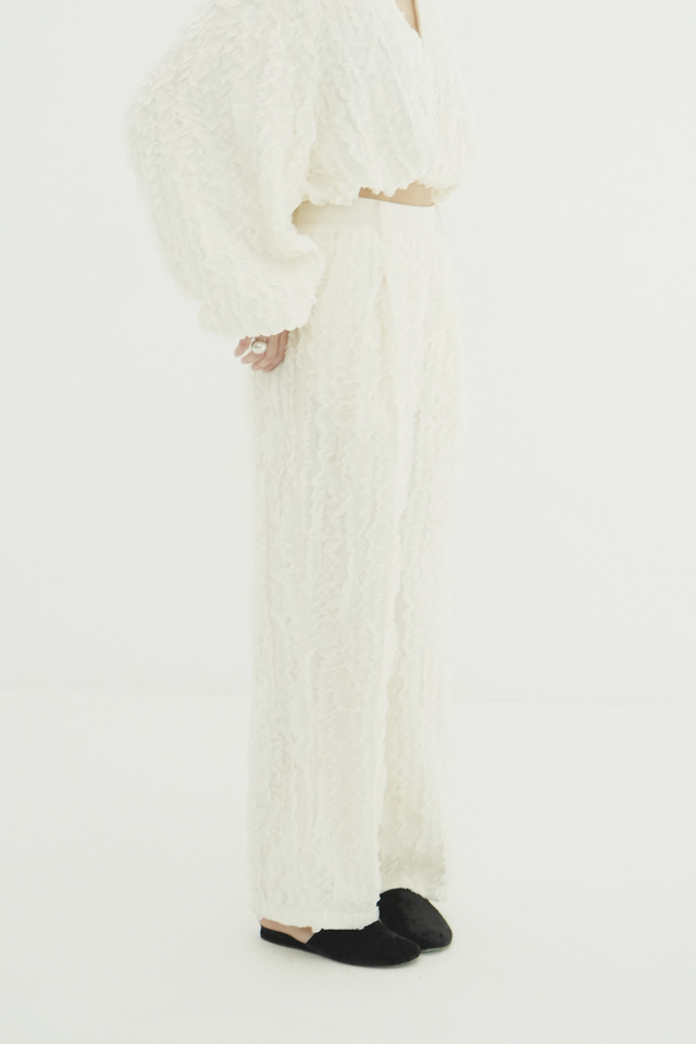 表情感のあるシアー素材に、程よいハリのフリルを太番手ステッチであしらったストレートパンツ。