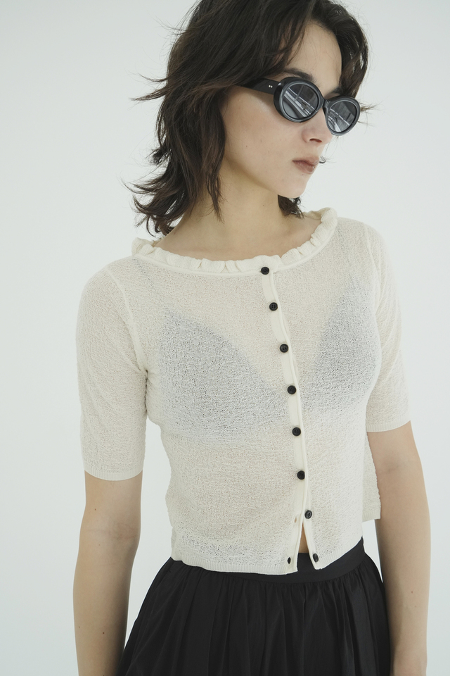 ほのかな透け感が美しいシアー素材に、ハリのあるフリルを太番手ステッチで施したボレロ。立体感のあるシルエットとフリルで、甘くなりすぎない印象に。