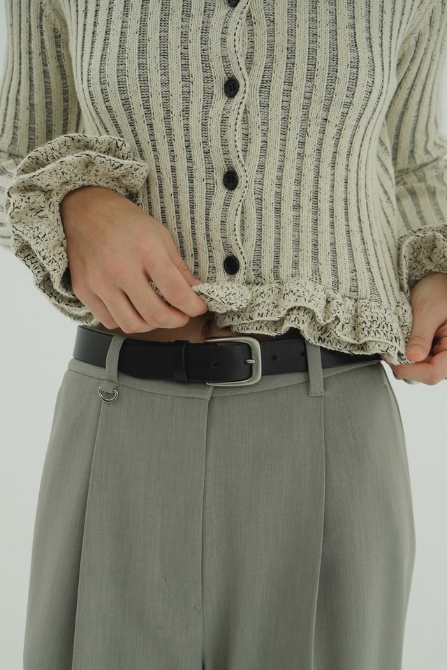 裾と袖口に、手編みのかぎ針フリルをあしらったW FACE仕様のニットトップス。甘くなりがちなフリルデザインを、ワイドリブの編み地で仕上げることで、程よくカジュアルダウンし、CLANEらしいバランスに仕上げました。着丈はジャストウエストで、ローウエストのアイテムと合わせると程よい肌見せをしていただけます。