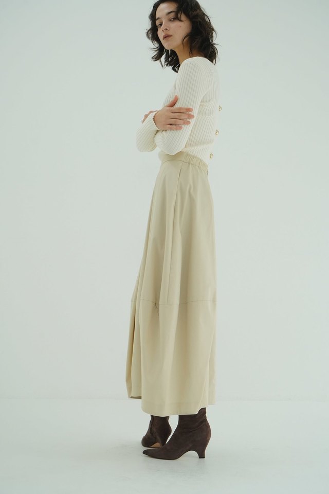 腰回りはすっきり仕上げ、トップスを選ばずスタイリングしやすいので、季節を問わず取り入れやすい一着。合わせるアイテムによってデイリーにもオケージョンにも使えます。歩くたびに表情が生まれる、CLANEらしい立体感を楽しめるスカートです。