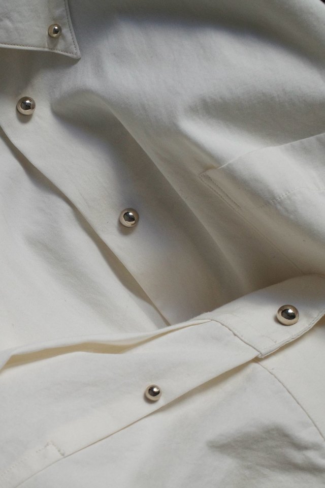 このシャツに施された球体スナップも、ハードなスタッズというより、女性らしい曲線を持つ“ジュエリー”のような存在。