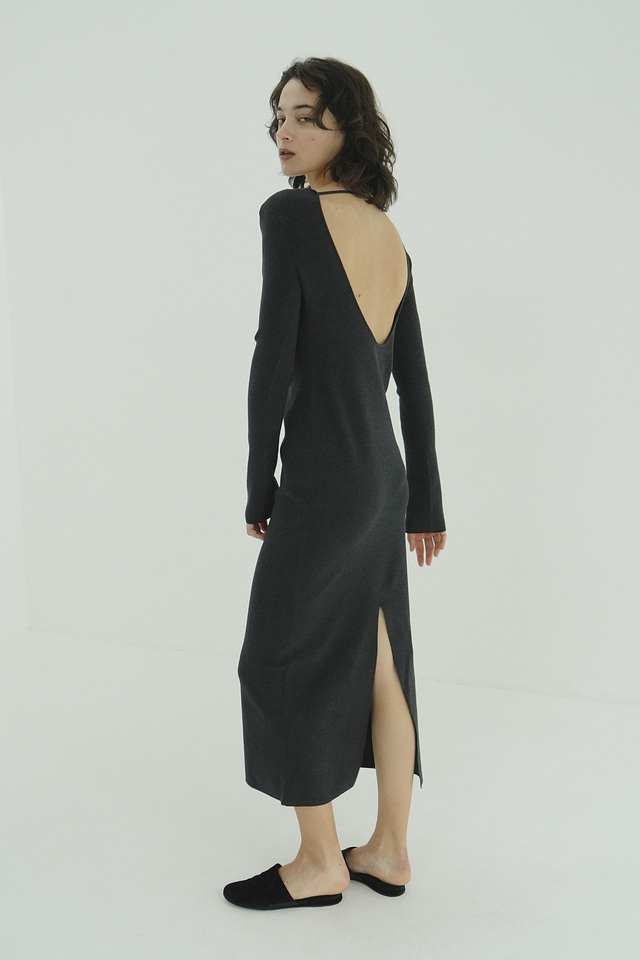 バックオープンデザインが目を惹く、細身シルエットのニットワンピース。