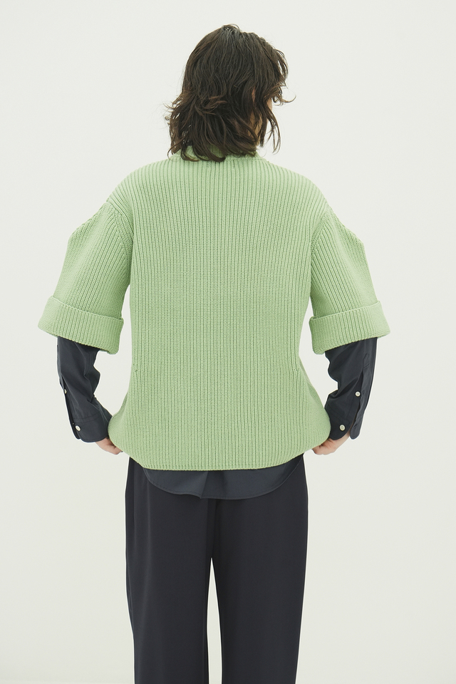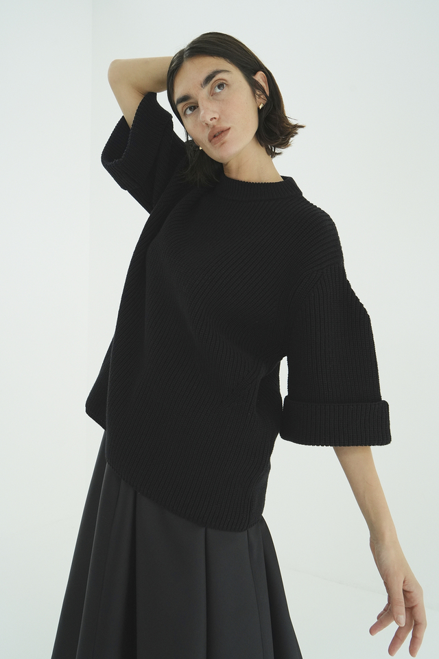 ボリュームのある膨らみ感を出すために、3種類の異なる素材を使用し、絶妙なキックバック感を出した拘りの糸を使用しています。ローゲージで片畔編みで表現し、半袖ながら重厚感のあるニットに仕上げました。