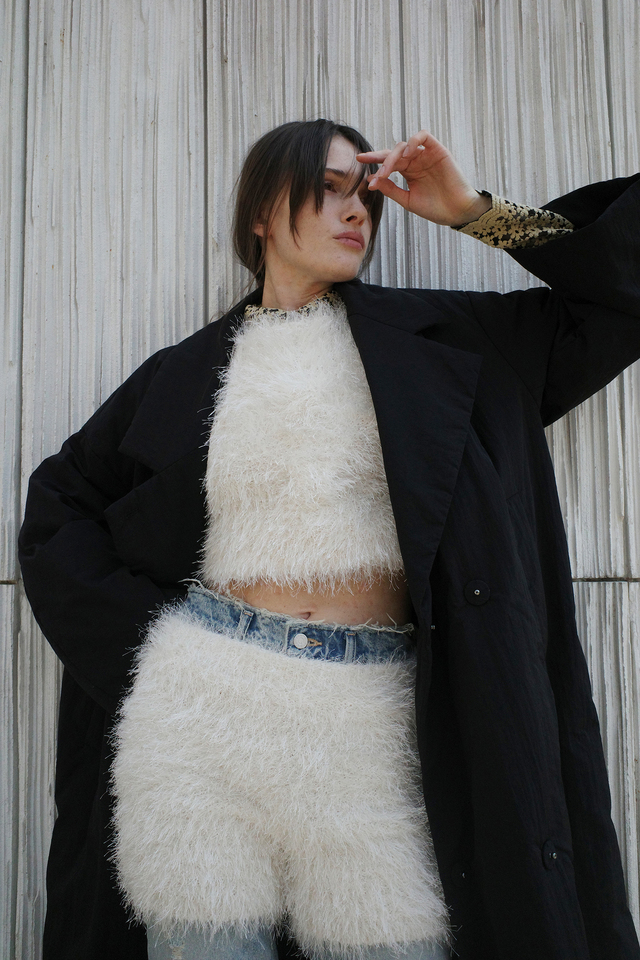 取り外し可能な肩パッドとカフスデザインを施し、CLANEらしいモードさをプラスしました。ボタンを全て留めてモードに、少し開けて女性らしく着こなすのもおすすめです。