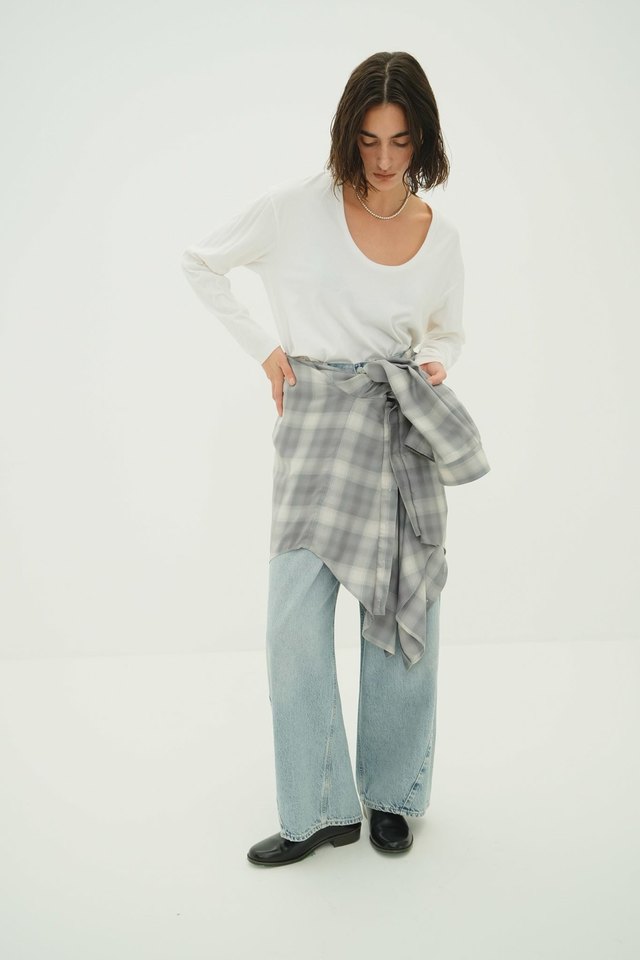全体はルーズなオーバーシルエットに仕上げつつ、両脇に施したボタンディテールによって、シャツを腰巻きしたようなミニスカートとしても着用可能。シャツ、ボトムスとスタイリング次第で表情を変えられる、CLANEらしいアレンジ性の高い一着です。