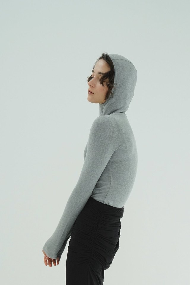 薄手のフード付きハイネックトップス。肌に吸い付くようなソフトでもちっとした生地を使用した、ストレスフリーな着用感が魅力です。シルエットはタイトに仕上げることで、女性らしいラインを引き立てます。