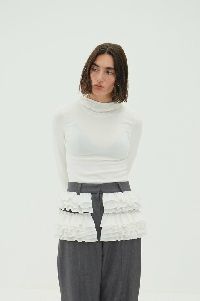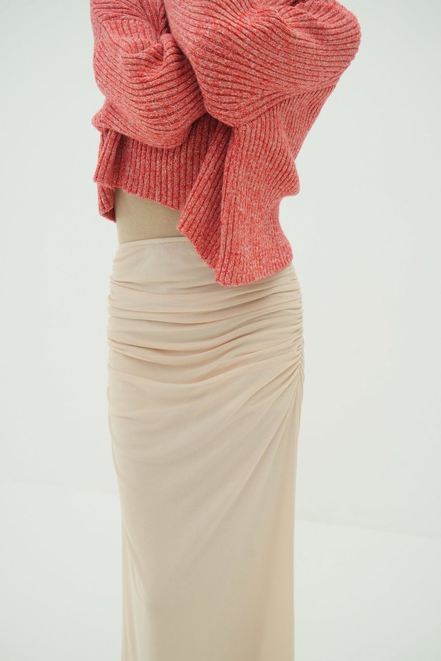 繊細な透け感が魅力のチュール素材で仕立てた、2WAY仕様のギャザースカート。表地にはさらりと軽やかなチュールを使用し、裏地には伸縮性のある柔らかな素材を合わせることで、動きに合わせてニュアンスの出る風合いに仕上げました。