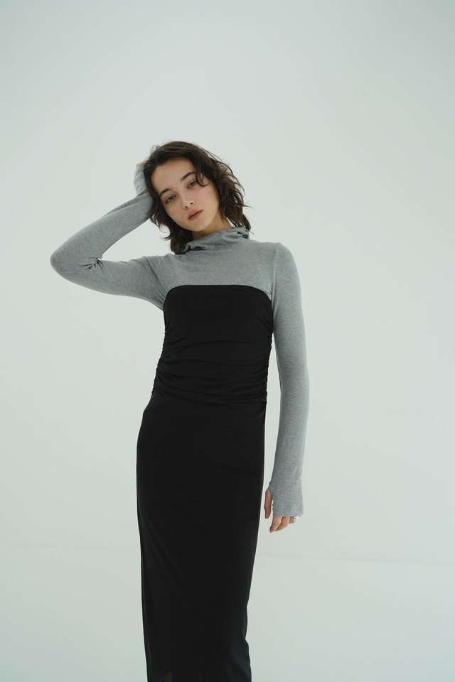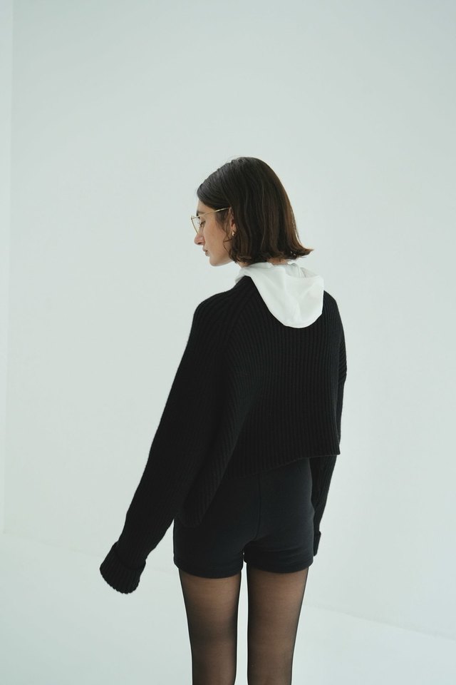 コンパクトなフードは一枚でトップスとして着用するのはもちろん、ジャケットやニットのインナーとしても収まりがよく、スタイリングに奥行きをプラスしてくれます。