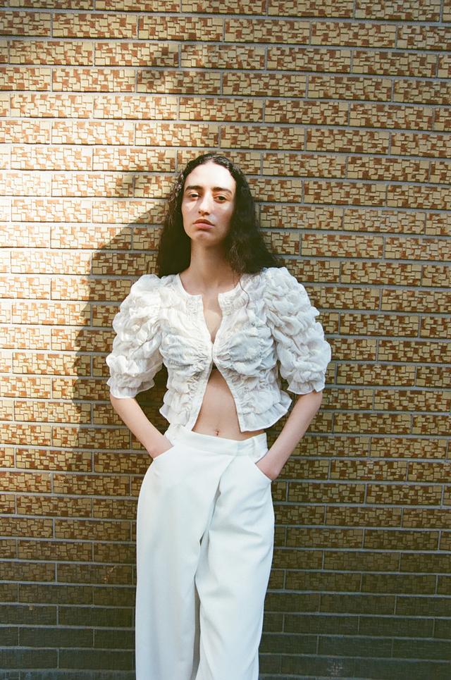 身頃はコンパクトに、袖にはパフスリーブを採用し緩急のついた立体的なシルエットに。袖丈は長めに設定しているため、二の腕もカバーいただけます。