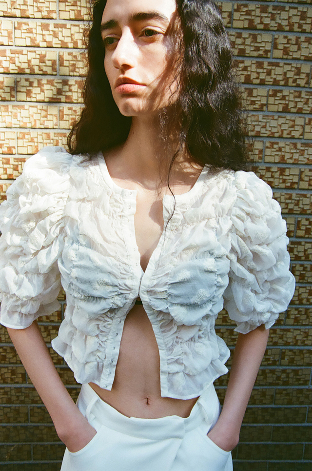 MINAMI TANAKA×CLANE W FACE FLOWER JACQUARD SHIRRING TOPS