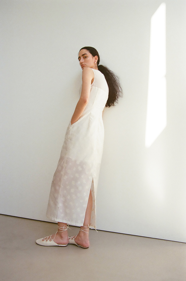 背中にはシアーの切り替えを施し、スカート裏地をあえてミニ丈に設定することで、歩くたびに足元へほのかな抜けが生まれる一着に仕上げています。