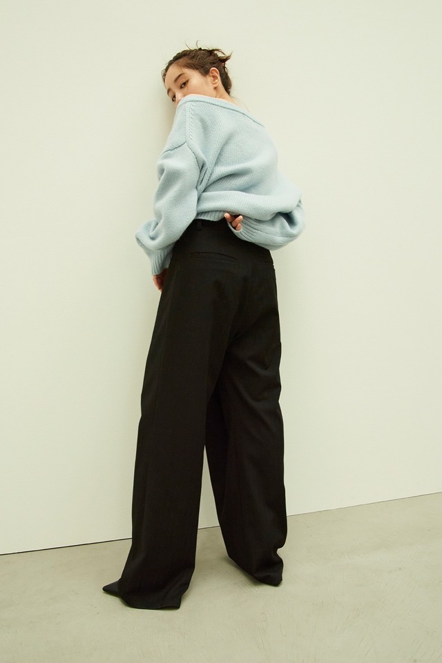 ウエストは、リラックス感のある履き心地のゴム仕様で、あえてポケットなどのディテールは加えず、上品でモードな印象に仕上げました。