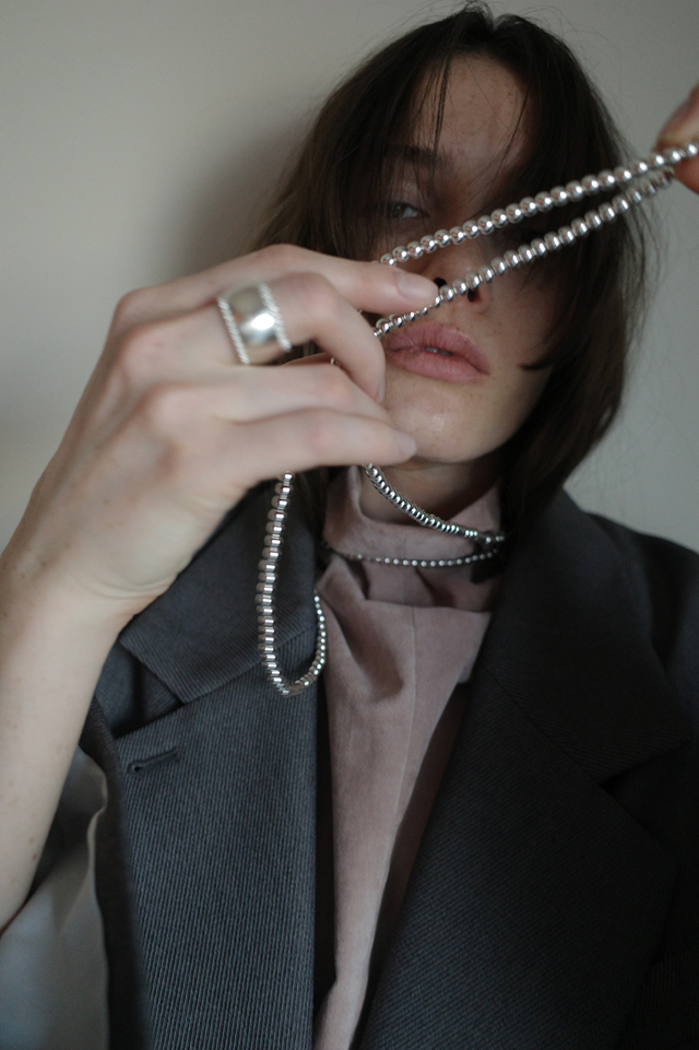 二重にして着用したり、首に巻きつけてチョーカーのようにアレンジしたりと、様々なスタイリングが楽しめるロングサイズのボールチェーンネックレス。素材は真鍮にシルバー925コーティングを施しており、軽量なので負担なく着用いただけます。