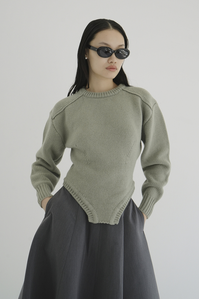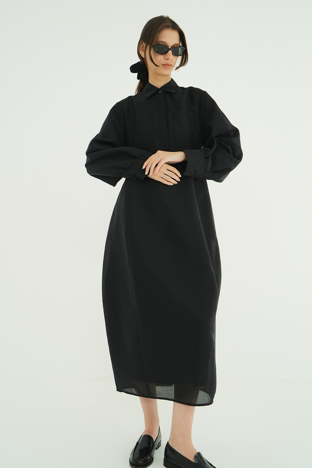 程よいシアー感とハリのある素材を使用し、スカート部分にボリュームが出るよう、構築的なコクーンシルエットに仕上げました。ウエストのシェイプが女性らしさの中にモードな印象をプラスしてくれます。