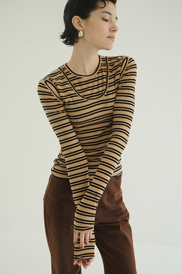 襟ぐりと袖をレイヤード風に仕上げ、アームホールにはさりげないホールカットを施すことで、シンプルながらもモードなアクセントに。ランダムボーダーは配色にこだわり、アクセントとなる一枚です。