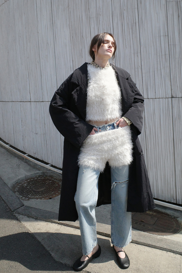 あえて短めの丈に設定し、低身長な方にも着用しやすく仕上げました。張り感があり軽い素材を使用しているので、大きなタックでフォルムが綺麗に出るところもポイントです。