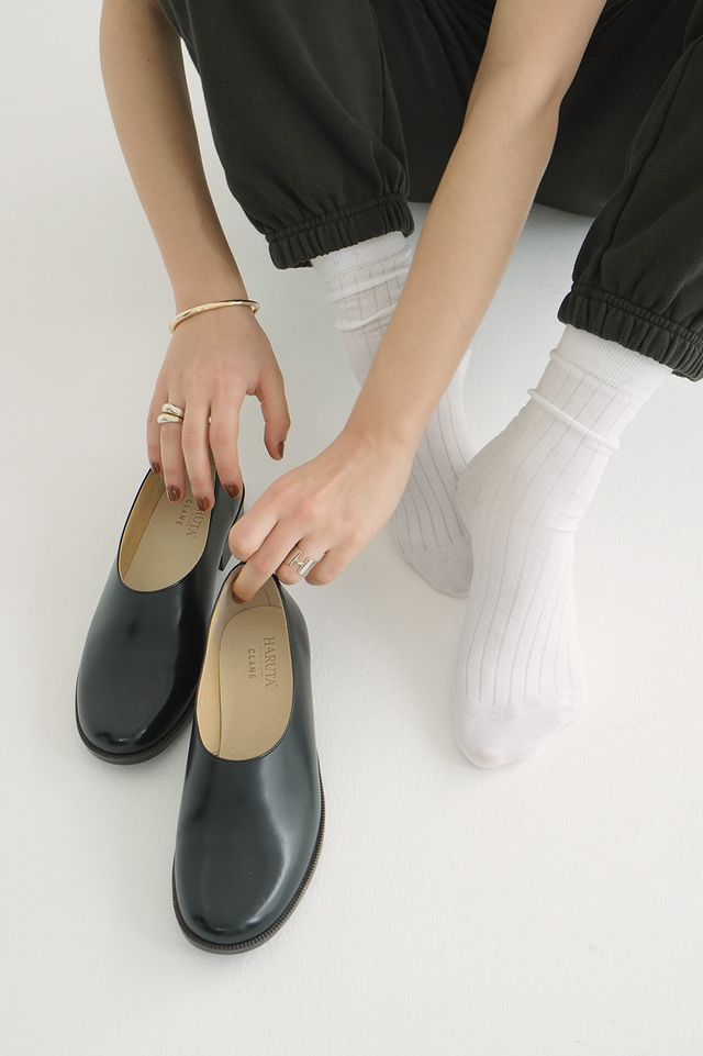 HARUTA×CLANEのフラットシューズは、シンプルながら存在感のある佇まいが魅力。
