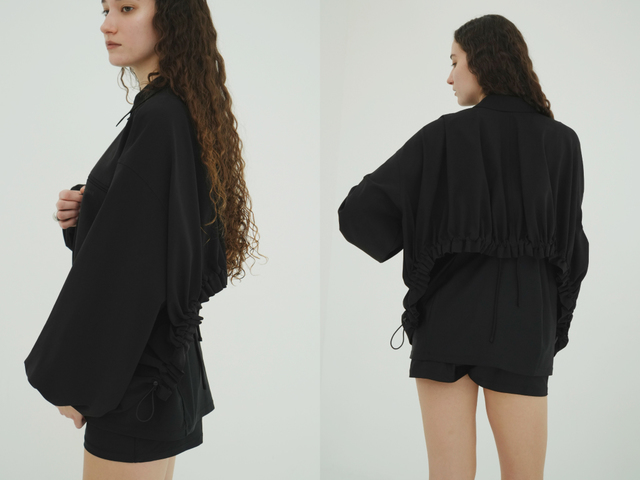 動くたびにバックスタイルに施したタックとギャザーデザインがアクセントに。軽やかな着心地で、アクティブシーンはもちろん、デイリーにも取り入れやすい一枚。