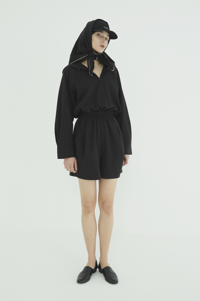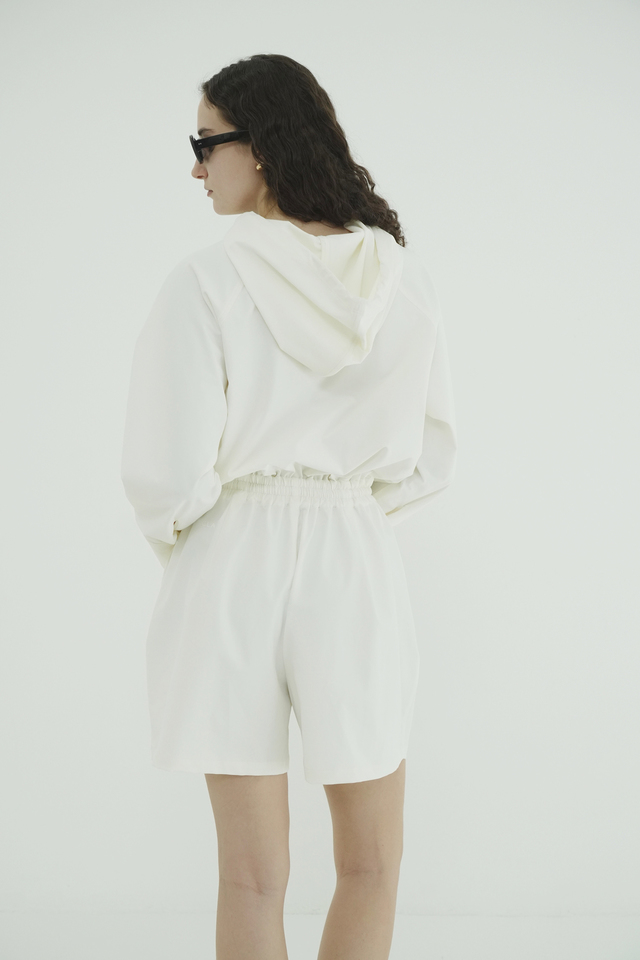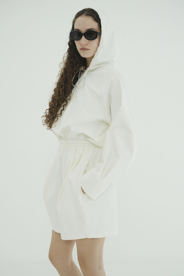 コクーンフレアーシルエットのハーフパンツが脚をすっきり見せ、軽やかでモードな印象に。一枚でコーディネートが完成し、アクティブなシーンを快適かつスタイリッシュに彩ります。