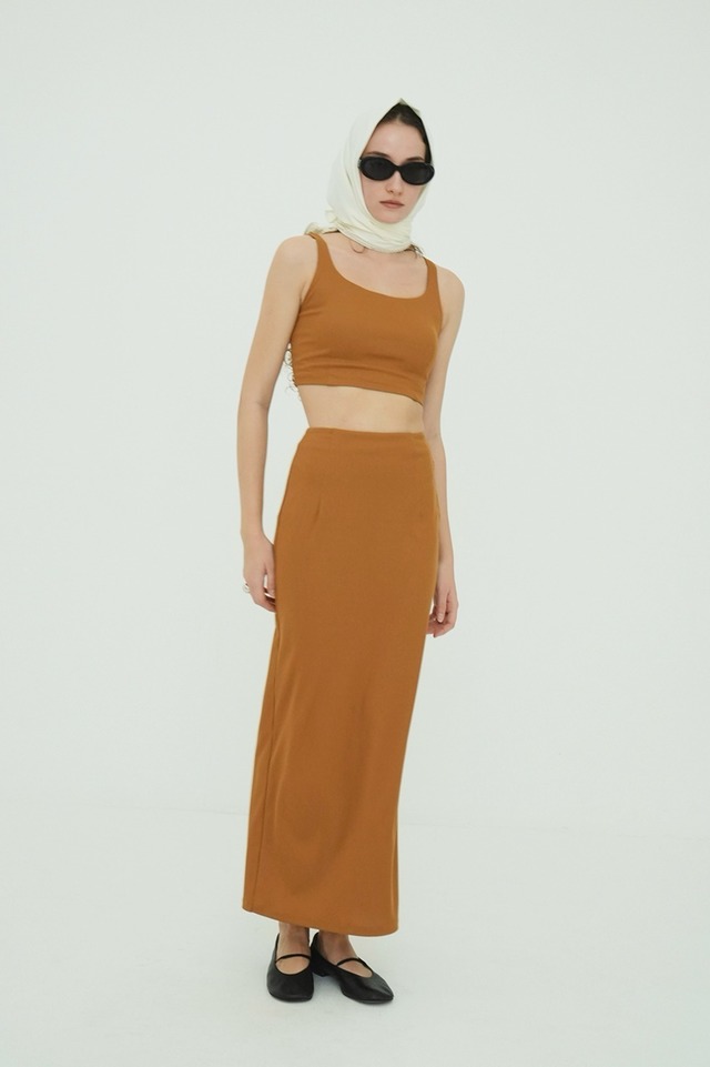 タイトシルエットのスカートには深めのバックスリットを施し、シャープなデザインと動きやすさを両立。ローウエストでの着用も可能で、スタイリングの幅が広がります。